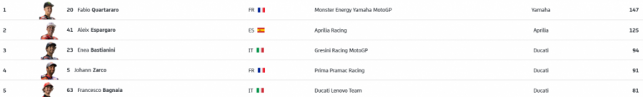 Trenutno na listi najboljih vozača Moto Grand prija, na prvoj poziciji nalazi se Fabio Kvartararo iz Francuske sa 147 poena, sledi ga Aleks Espargaro, brat Pola Espargara koji je doživeo nesreću u Nemačkoj. sa 125, a zatim slede ITalijan enea Bastianini 94, Žan Zarko iz Francuske sa 91 poenom, dok je trenutno petoplasirani Frančesko Banjaja iz Italije sa 81 osvojenim poenom.