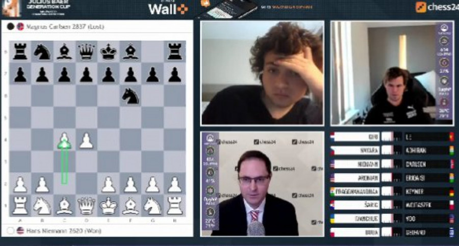 Hans Nieman (19) je pre nekoliko nedelja u trećem kolu Sinkefild kupa s crnim figurama iznenađujuće pobedio peterostrukog uzastopnog svetskog prvaka Magnusa Karlsena, koji je bio neporažen u prethodne 53 partije. Foto: Twitter.com/chess24.com