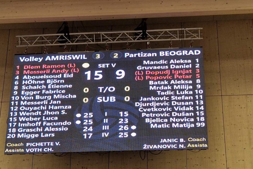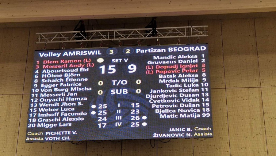 Odbojkaši Partizana u prvom meču šesnestine finala Kupa CEV izgubili su 3:2 (25:15, 25:23, 24:26, 17:25, 15:9) od Amersvila.