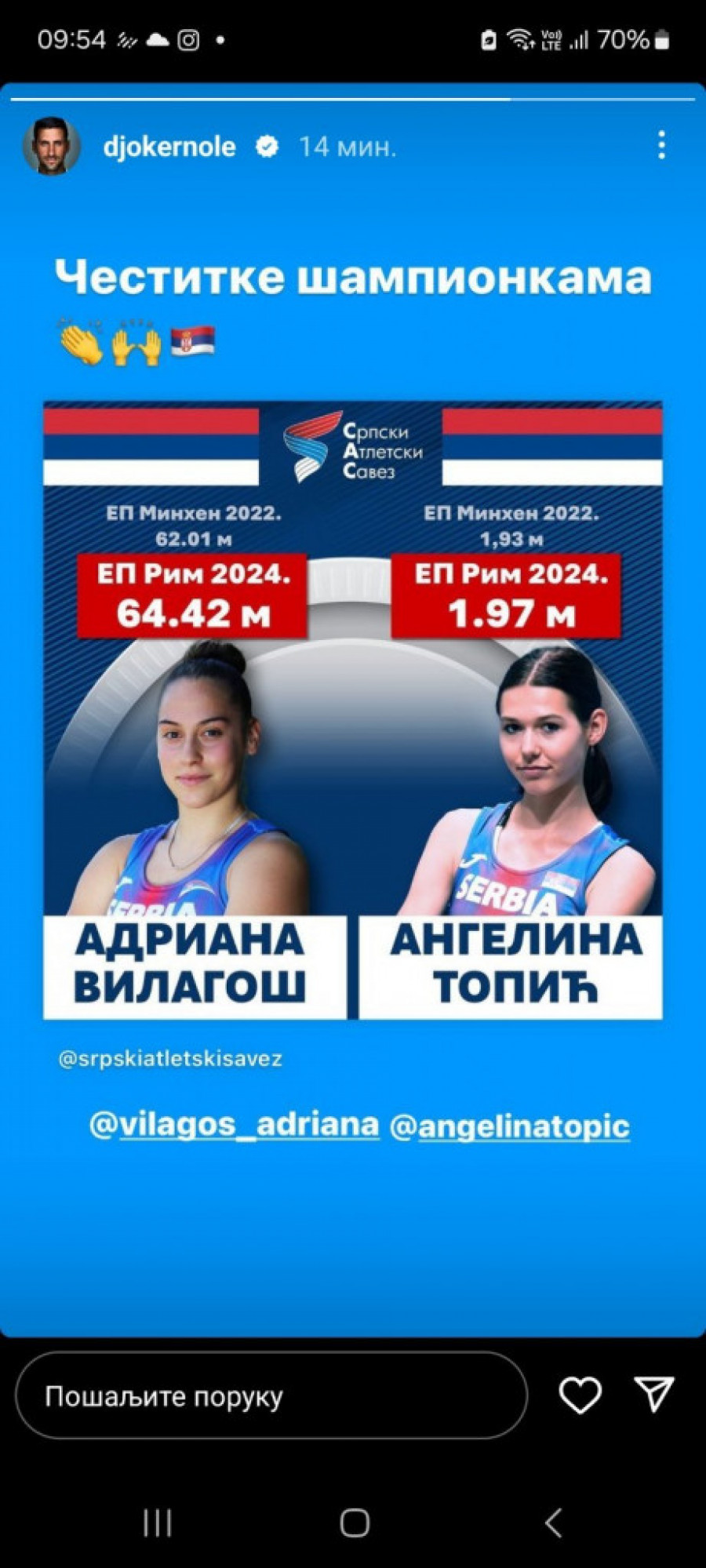 Na Evropskom prvenstvu u Rimu, srpska atletičarka Andriana Vilagoš postigla je izuzetan uspeh osvajanjem srebrne medalje. Vilagoš je do srebra stigla hicem u trećoj seriji od 64,42 metra, čime je oborila nacionalni rekord Srbije. Ovaj izuzetan rezultat nije samo doneo medalju, već je atletičarka obezbedila i normu za učešće na Olimpijskim igrama u Parizu.