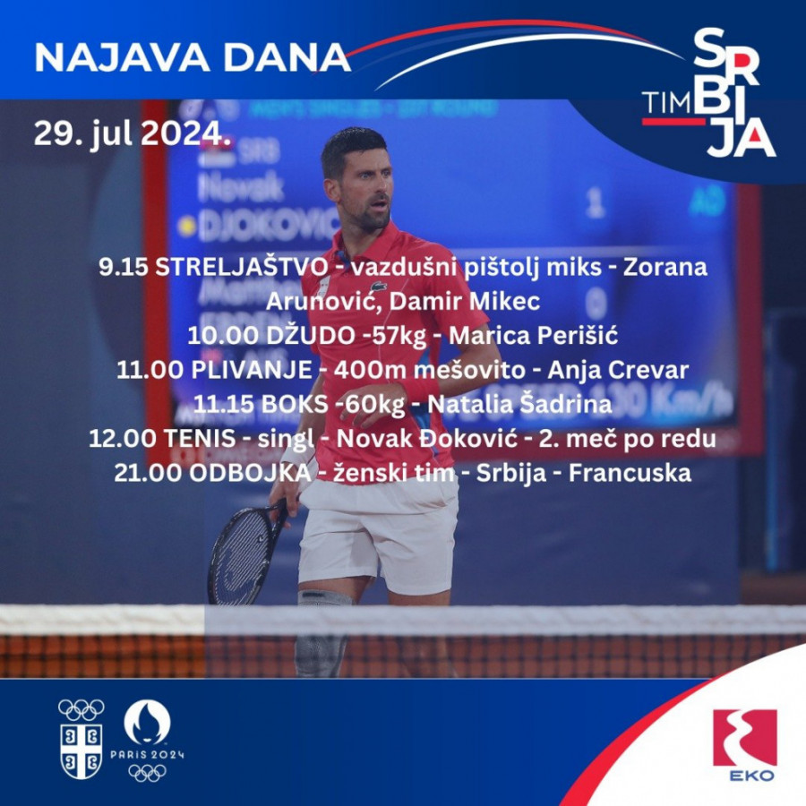 Nakon izuzetno uzbudljivog dana na Olimpijskim igrama u Parizu, koji je obeležen mečevima muške i ženske košarkaške reprezentacije, kao i duelima vaterpolista i odbojkaša, ali i učešćem naših sportista u pojedinačnoj konkurenciji, sledi nam još jedan dan pun nade i strepnje.
