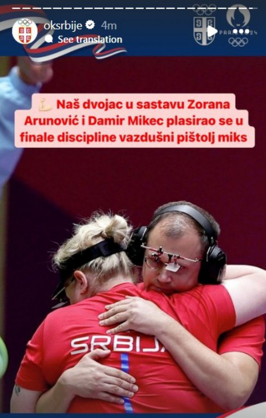 Srbija je ostvarila istorijski uspeh na Olimpijskim igrama u Parizu osvajanjem prve medalje. Damir Mikec i Zorana Arunović su se plasirali u borbu za odličje u disciplini vazdušni pištolj miks, osiguravši barem srebrnu medalju. Nakon što su zauzeli drugo mesto u kvalifikacijama, naši takmičari će se suočiti sa prvoplasiranom Turskom u raspucavanju za zlatnu medalju. Finalno takmičenje počinje u 10.00 časova u utorak 30. jula, a Srbija će sa nestrpljenjem iščekivati ishod ove borbe za istorijsko odličje.