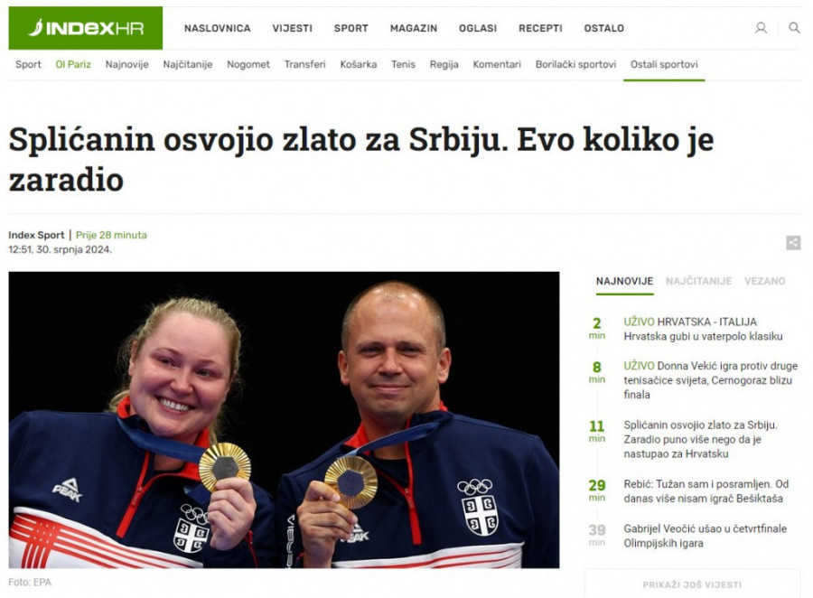 Uz priču o životu zlatnog srpskog olimpijca, hrvatski mediji se bave i novčanom nagradom koju država Srbija isplaćuje osvajačima medalja na Olimpijskim igrama u Parizu. Posebno ističu da naša zemlja svakom osvajaču najsjajnijeg odličja isplaćuje 200.000 evra, a unosnije nagrade imaju samo Izrael (253.000 evra) i neprikosnovena Južna Koreja (708.000 evra).