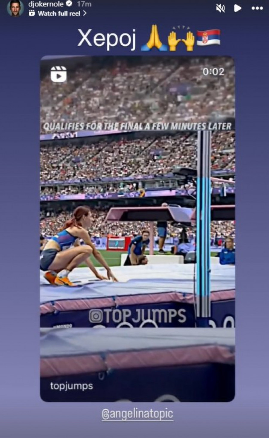 Nakon što je srpska atletičarka Angelina Topić hrabro preskočila visinu uprkos teškoj povredi skočnog zgloba, najbolji srpski teniser Novak Đoković oglasio se na društvenim mrežama. Podelio je video snimak koji prikazuje Angelinin herojski skok sa bandažiranom nogom, uz komentar: "Heroj". Ova reakcija je izazvala veliku pažnju javnosti i pokazala podršku koju sportisti pružaju jedni drugima u teškim trenucima.