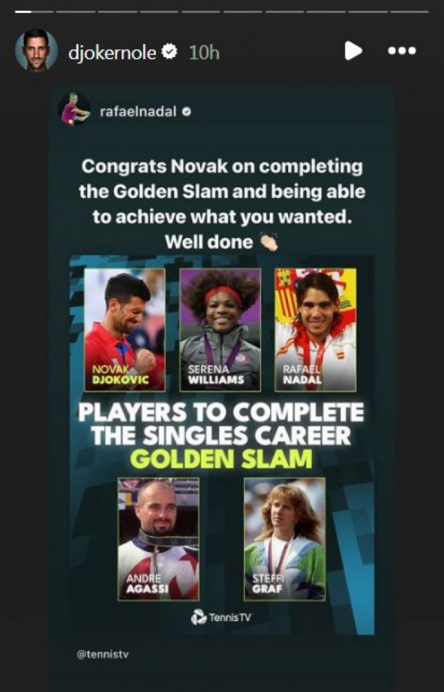 Novak Đoković, najbolji teniser u istoriji belog sporta savladao je u finalu Olimpijskih igara u Parizu Karlosa Alkaraza rezultatom 2:0 (7:6, 7:6) čime ne samo da se okitio zlatnom medaljom, čime ne samo da je stigao do jedinog trofeja kojeg nije imao u svojoj prebogatoj riznici, već je zaokružio i "karijerni slem" što je pre njega pošlo za rukom samo Andreu Agasiju, Štegi Graf, Sereni Vilijams i Rafaelu Nadalu.