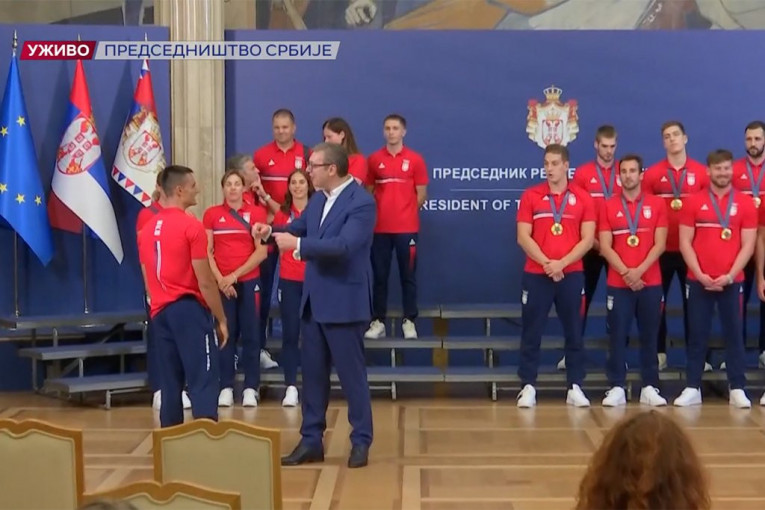 19.07 - Predsednik Vučić se prvo pozdravio i čestitao Nikoli Jakšiću, kapitenu vaterpolo reprezentacije Srbije.