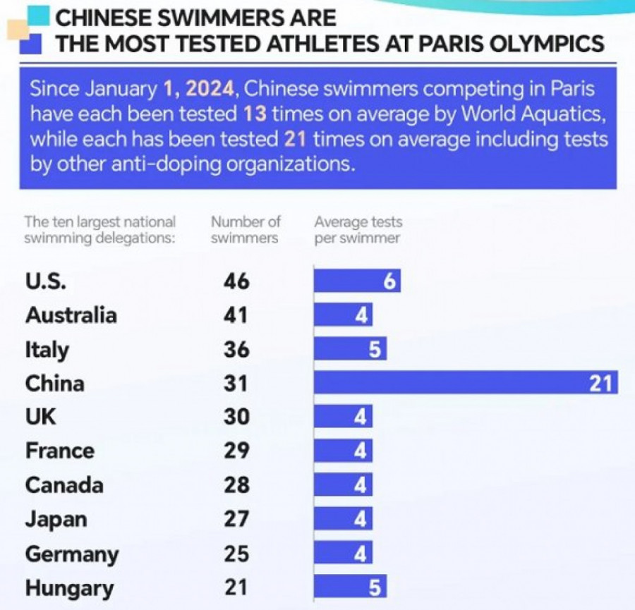 Istovremeno Svetska antidoping agencija ističe licemerje Amerikanaca za koje se sumnja da su od 2011. godine dozvoljavali svojim sportistima da dopingovani učestvuju na takmičenjima, da su upravo oni bili ključni faktor u isključenju ruskih sportista sa Olimpisjkih igada 2020. i 2022. godine. Takođe se ističe da je su Amerikanci tokom OI 2024 otpužili kineske sportiste za doping, usled čega su plivači ove zemlje prosečno testirani na nedozvoljene supstance čak 21 put, dok su američki sportisti svega po šest puta bili kontrolisani.