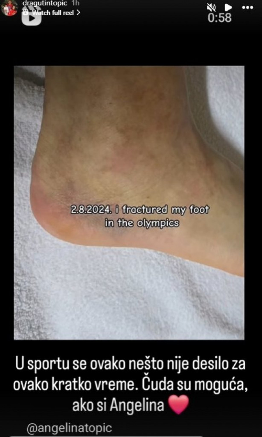 Angelinina najvernija podrška u svemu, njen otac Dragutin Topić, je na svom instagram profilu podelio video Angelininog procesa oporavljanja, treniranja i osvajanja zlatne medalje na svetsom prvenstvu za juniore, čak dva puta.
