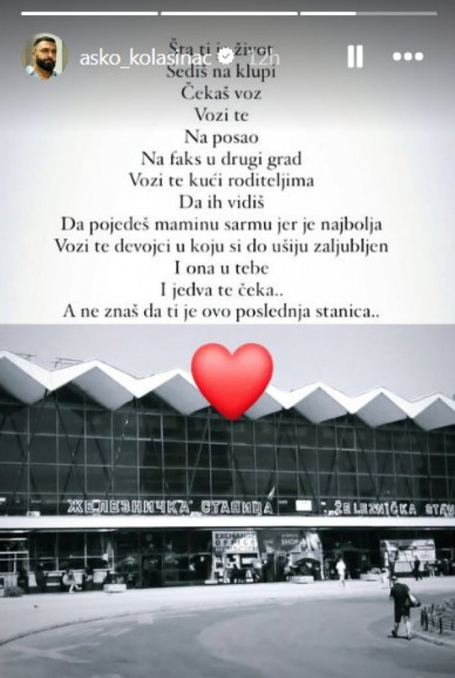 - Šta ti je život. Sediš na klupi, čekaš voz, vozi te, na posao, na faks u drugi grad, vozi te kući roditeljima, da ih vidiš, da pojedeš maminu sarmu jer je najbolja, vozi te devojci u koju si do ušiju zaljubljen i ona u tebe i jedva te čeka... A ne znaš da ti je ovo poslednja stanica - napisao je Kolašinac na društvenoj mreži Instagram.