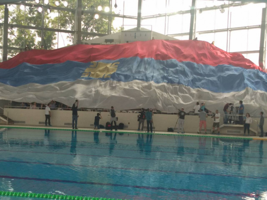 Uz srpsku trobojku koja je u potpnosti prekrila tribine na bazenu SC "Milan Gale Muškatirović" naši vaterpolisti u majicama na kojima je bila ispisana poruka "Igram za Srbiju" poklonili su se punim tribinama.