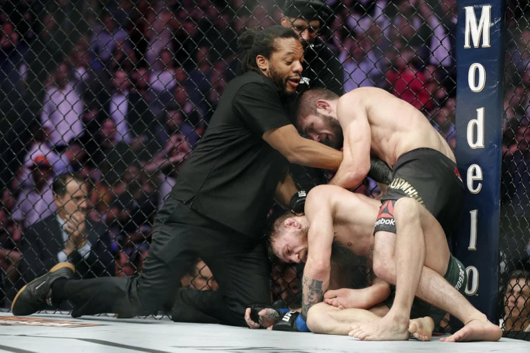 Foto: Tanjug/APHabib je preskočio ogradu i uleteo je u publiku da se obračuna sa nekim. Oba tima su ušla u ring i nije se znalo ko koga udara. Ipak, momak iz Dagistana ima je poseban pik na jednog čoveka koji je stajao pored kaveza.