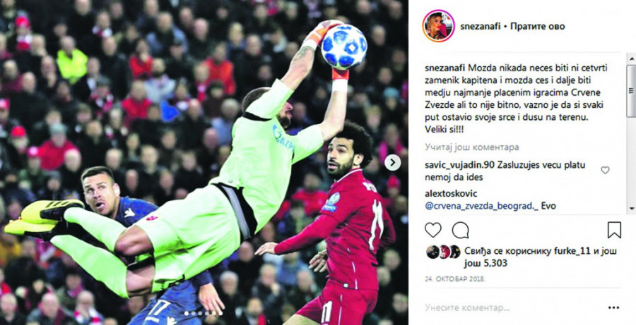 - Možda nikada nećeš biti ni četvrti zamenik kapitena, možda ćeš i dalje biti među najmanje plaćenim igračima Crvene zvezde, ali to nije bitno, važno je da si svaki put ostavio srce i dušu na terenu. Veliki si - napisala je na Instagramu Snežana posle poraza Zvezde u Liverpulu (4:0).