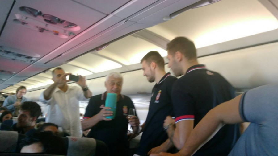 Naši košarkaški reprezentativci vratili su se u zemlju posle osvojene srebrne medalje na Evropskom prvenstvu, pa iako su nas ponovo izuzetno obradovali, oni se nisu veseli ukrcali u avion koji ih je iz Istanbula vozio za Beograd - za njih drugo mesto nije bilo ono što su priželjkivali. Na sreću, "smorenost" u avionu nije dugo trajala - kada je posada iznela tortu za naše reprezentativce, "ukrasivši" to i šampanjcem - tuga je nestala!