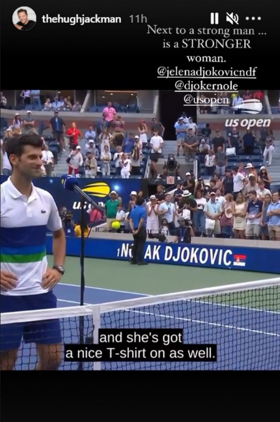- Pored jakog muškarca uvek stoji jaka žena - napisao je Džekmen, a kao "prilog" je dodao video snimak sa Noletovog meča na kom je Jelena nosila majicu sa likom Novaka kao vuka.