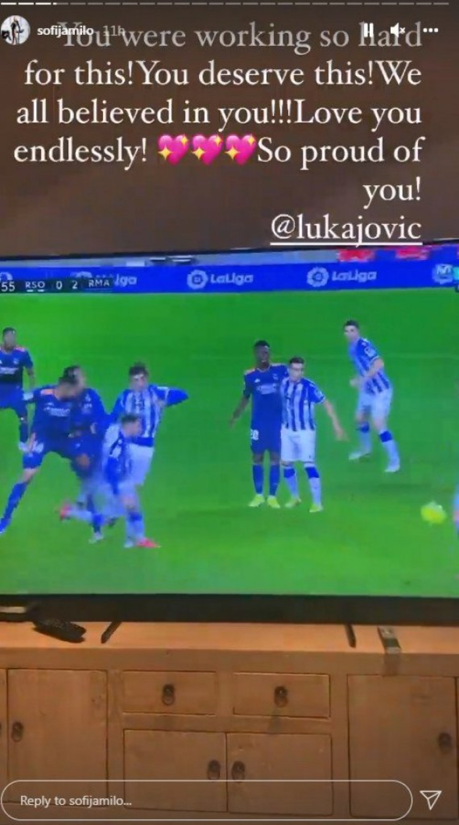 Inače, ovo je samo jedna u nizu objava Jovićeve verenice, koja je u petom mesecu trudnoće. Miloševićeva je Lukin gol podelila više puta, kao i post u kome je Srbin proglašen za igrača utakmice "derbija imenjaka" odigranog u Sosijedadu.