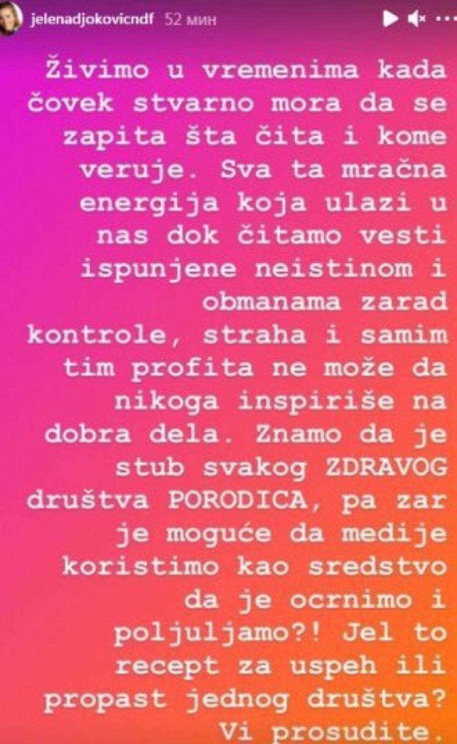 - Živimo u vremenima kada čovek stvarno mora da se zapita šta čita i kome veruje. Sva ta mračna energija koja ulazi u nas dok čitamo vesti ispunjene neistinom i obmanama zarad kontrole, straha i samim tim profita ne može da nikoga inspiriše na dobra dela. Znamo da je stub svakog zdravog društva porodica, pa zar je moguće da medije koristimo kao sredstvo da je ocrnimo i poljuljamo?! Jel to recept za uspeh ili propast jednog društva? Vi prosudite - napisala je Jelena svojevremno na svom Instagramu.