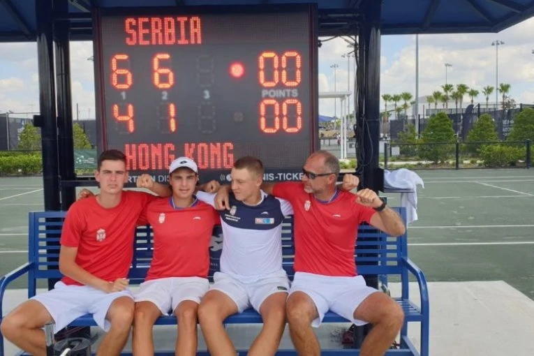 Foto: TSSJuniorska Dejvis kup selekcija Srbije u sastavu: Hamad Međedović, Stefan Popović i Petar Teodorović, predvođeni trenerom Vladimirom Krstićem plasman među četiri najbolja tima sveta ostvarili su ponedom protiv tima iz Hong Konga 3:0 (Petar Teodorović – Tim Thomas Gauntlett 6:4, 4:0 predaja, Hamad Međedović – Chak Lam Coleman Wong 6:4, 6:1, dubl: Teodorović, Popović – Wai, Wong 6:2, 6:2). Za plasman u finale Srbija će se boriti protiv selekcije Japana.