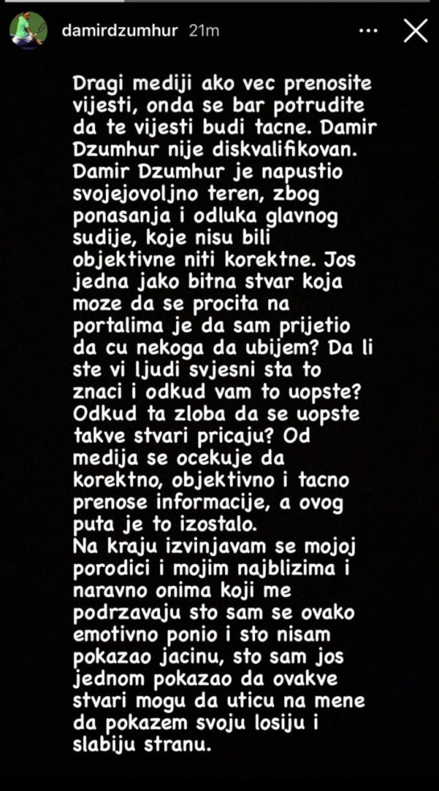 - Dragi mediji ako već prenosite vesti onda se bar potrudite da te vesti budu tačne. Damir Džumhur nije diskvalifikovan. Damir Džumhur je svojevoljno napustio teren, zbog ponašanja i odluka glavnog sudije koje nisu bile objektivne ni korektne. Još jedan jako bitna stvar koja može da se pročita na portalima je da sam pretio nekoga da ubijem? Da li ste vi ljudi svesni šta to uopšte znači i otkud vam to uopšte? Otkud ta zloba da se takve stvari pričaju uopšte? Od medija se očekuje da objektivno, koretkno i istinito prenose informacije, a ovog puta je to izostalo.Na kraju izvinjavam se mojoj porodici, mojim najbližima i naravno onika koji me podržavaju što sam se ovako emotivno poneo, i što nisam pokazao jačinu, što sam još jednom pokazao da ovakve stvari mogu da utiču na mene da pokažem svoju lošiju i slabiju stranu- napisao je teniser.