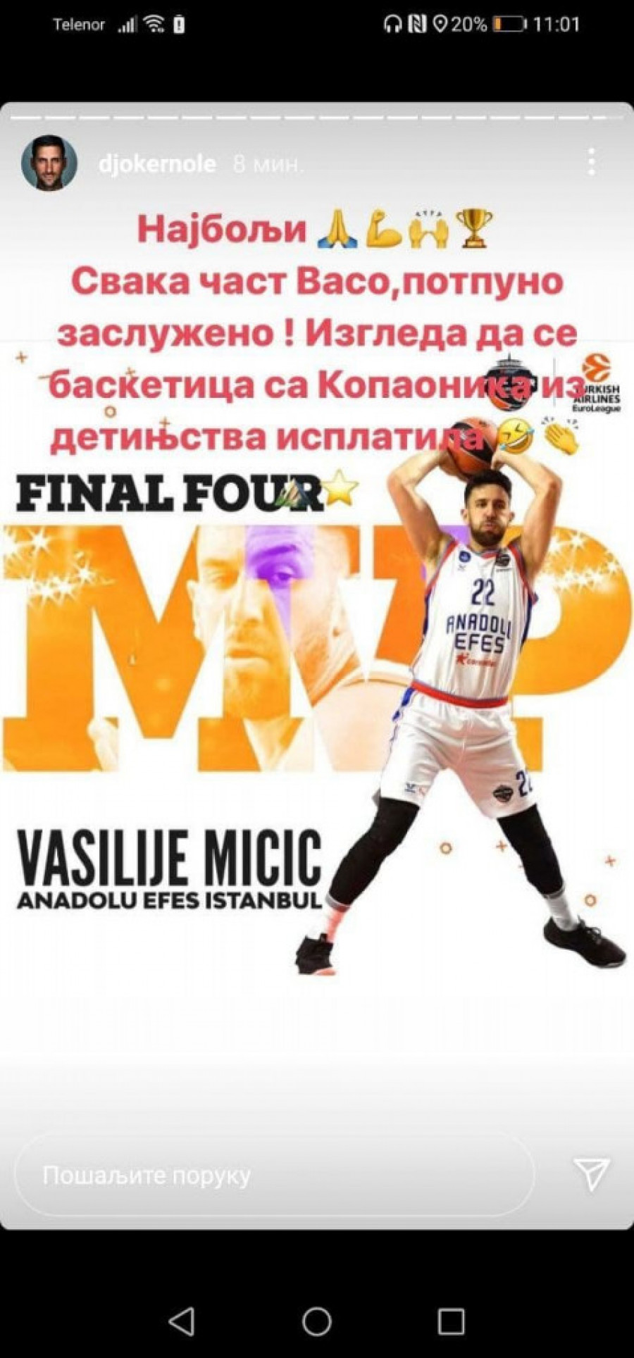 Najbolji teniser sveta Novak Đoković čestitao je Vasiliju Miciću titulu u Evroligi i zvanje MVP-a fajnal fora.