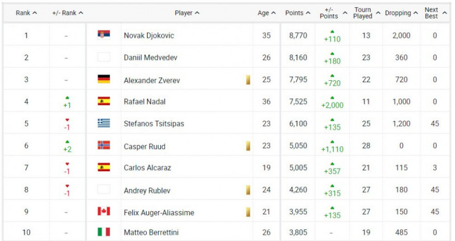 Ovog ponedeljka, 6. juna do promena i dalje nije došlo. Najbolji teniser sveta i dalje je Novak Đoković, ali se zna da će tu poziciju zadržati samo do narednog ponedeljka. Srpski kralj tenisa ima 8.770 poena, odnosno 610 poena više od drugoplasiranog ruskog tenisera Danila Medvedeva.