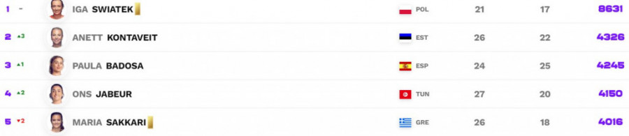 To se naravno odrazilo i na najnoviju WTA listu, na kojoj poljska teniserka Iga Švjontek sada ima ukupno 8.631 poen, što je gotovo duplo više od drugoplasirane Anet Kontavejt iz Estonije koja je sakupila 4.326.