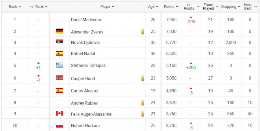 Kada je reč o samoj ATP listi i dalje je vodeći teniser sveta Rus, Danil Medvedev koji je u odnosu na prethodnu nedelju izgubio 205 bodova, ali sa osvojenih 7.955 poena i dalje ima prednost u odnosu na Aleksandra Zvereva. Nemac zbog povrede propušta ovogodišnji Vimbldon.