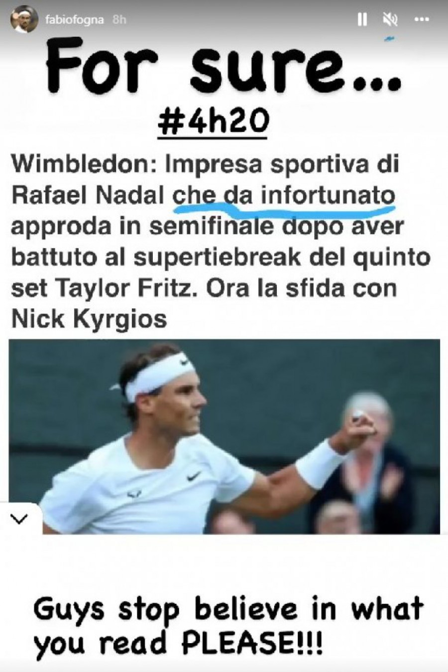 Ovom pobedom Rafael Nadal je još jednom pokrenuo lavinu pitanja u teniskom svetu, a jedan od onih koji sumnjaju u navodnu povredu španskog tenisera jeste i Italijan Fabio Fonjini.