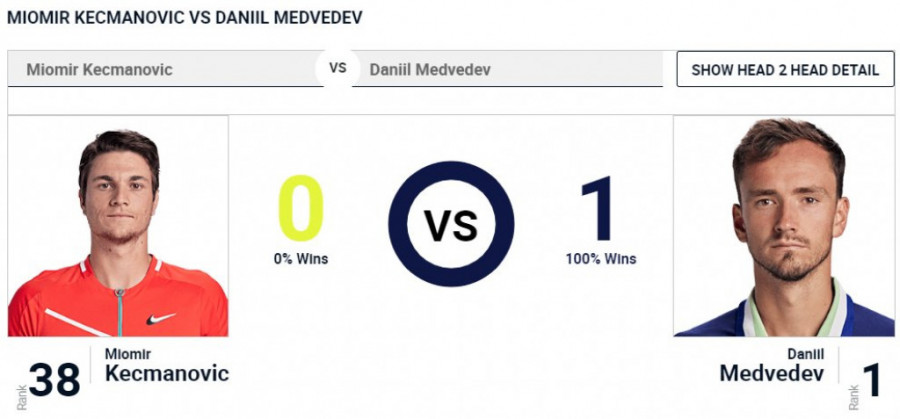 Miomir Kecmanović i Danil Medvedev do sada su odigrali samo jedan zvanični meč. Bilo je to na ovogodišnjem Rolan Garosu, a ruski teniser je ostvario obedljiv trijumf rezultatom 3:0 (6:2, 6:4, 6:2).