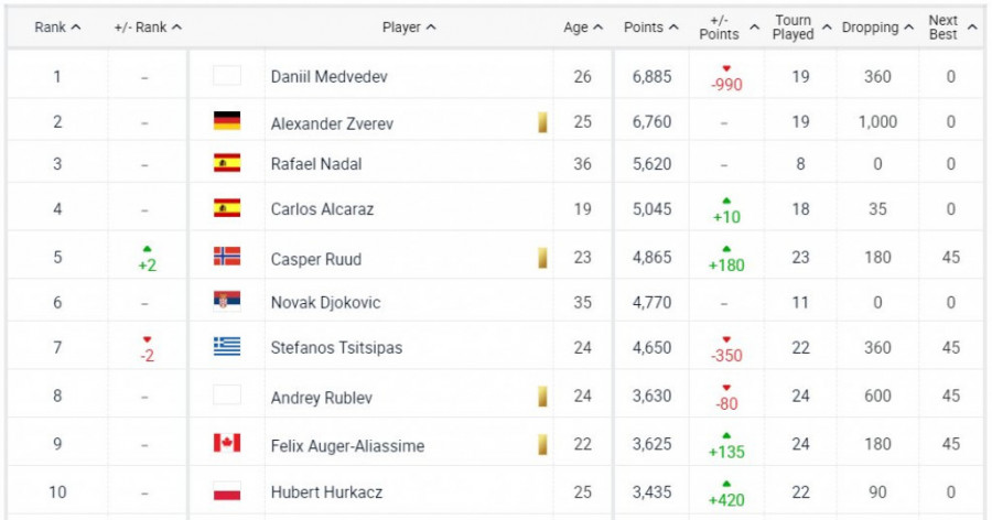 Trenutno najbolji teniser sveta i dalje je Danil Medvedev koji je u odnosu na prethodnu nedelju izgubio čak 990 poena, a pa je izvesno da će uskoro ovo mesto prepustiti nekom drugom. Nemac Aleksandar Zverev je drugoplasirani, a zatim sledi španski dvojac Rafael Nadal i Karlos Alkaraz, dok se u TOP 5 tenisera sveta sada probio Norvežanin Kasper Rud koji ima 95 poena više od srpske teniske ikone.