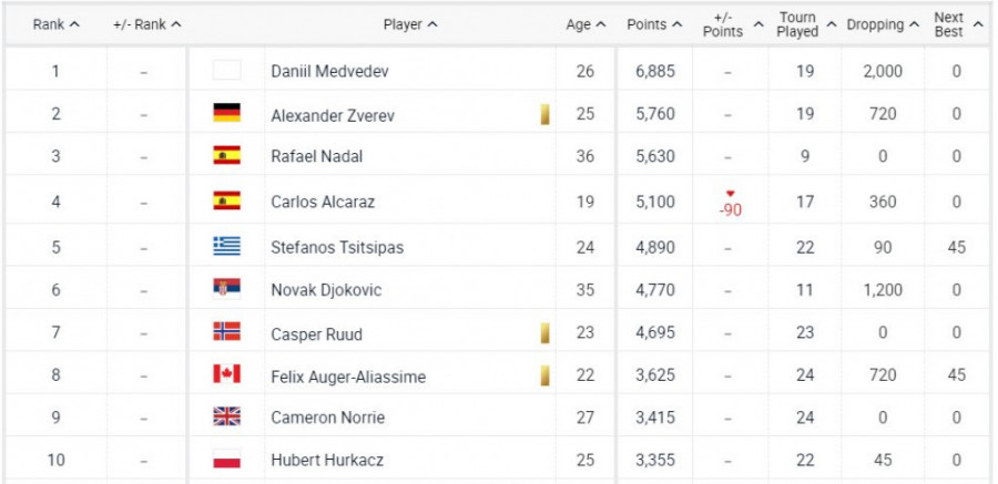 Najbolji srpski teniser Novak Đoković i dalje je šestoplasirani na ovoj listi sa 75 bodova više u odnosu na Norvežanina Kaspera Ruda, a listu TOP 10 igrača sveta zaokružuju Feliks Ože-Alijasim, Kameron Nori i Hubert Hurkač.