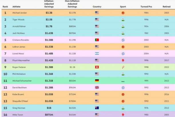 Američki portal "Sportiko" objavio je listu sportista koji su najviše novca zaradili tokom karijere i posle povlačenja iz statusa aktivnog takmičara.