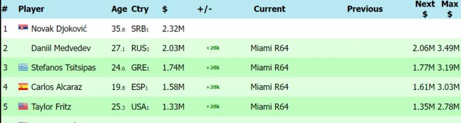 Svoju priliku da se popnu na vrh ove liste vrebaju Stefanos Cicipas i Alkaras, jer trijumf na Floridi donosi preko 1,2 miliona dolara.