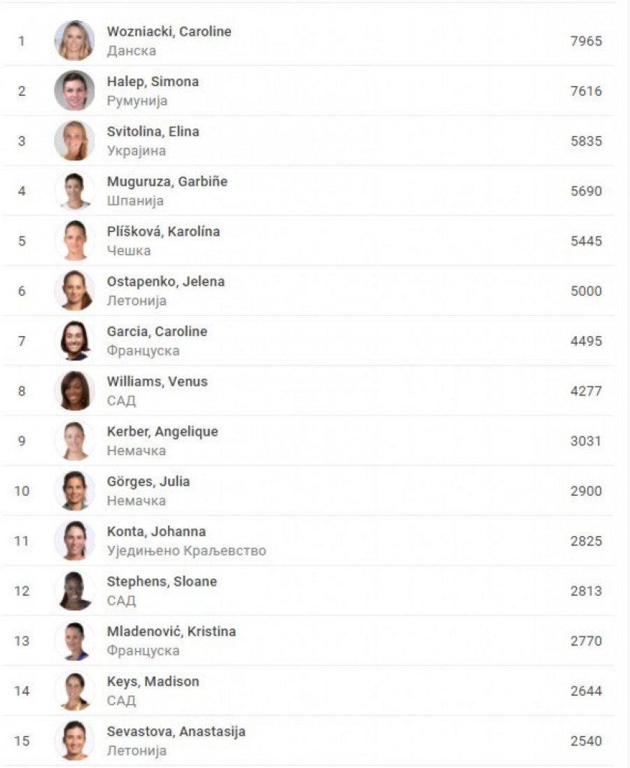 Foto: instagram.com/alexkrunicPrva igračica sveta i dalje je Karolina Voznijacki sa 7965 poena, sa 349 bodova manje sledi je Simona Halep.