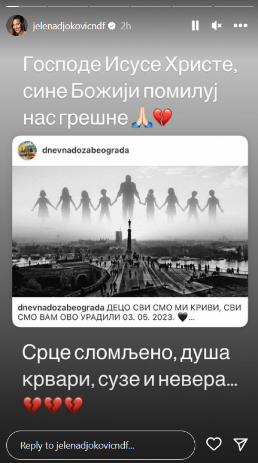 Jelena Đoković, supruga najboljeg tenisera planete Novaka Đokovića, oglasila se putem Instagrama srceparajućom objavom, kojom je odala počast stradalima u masakru na Vračaru.