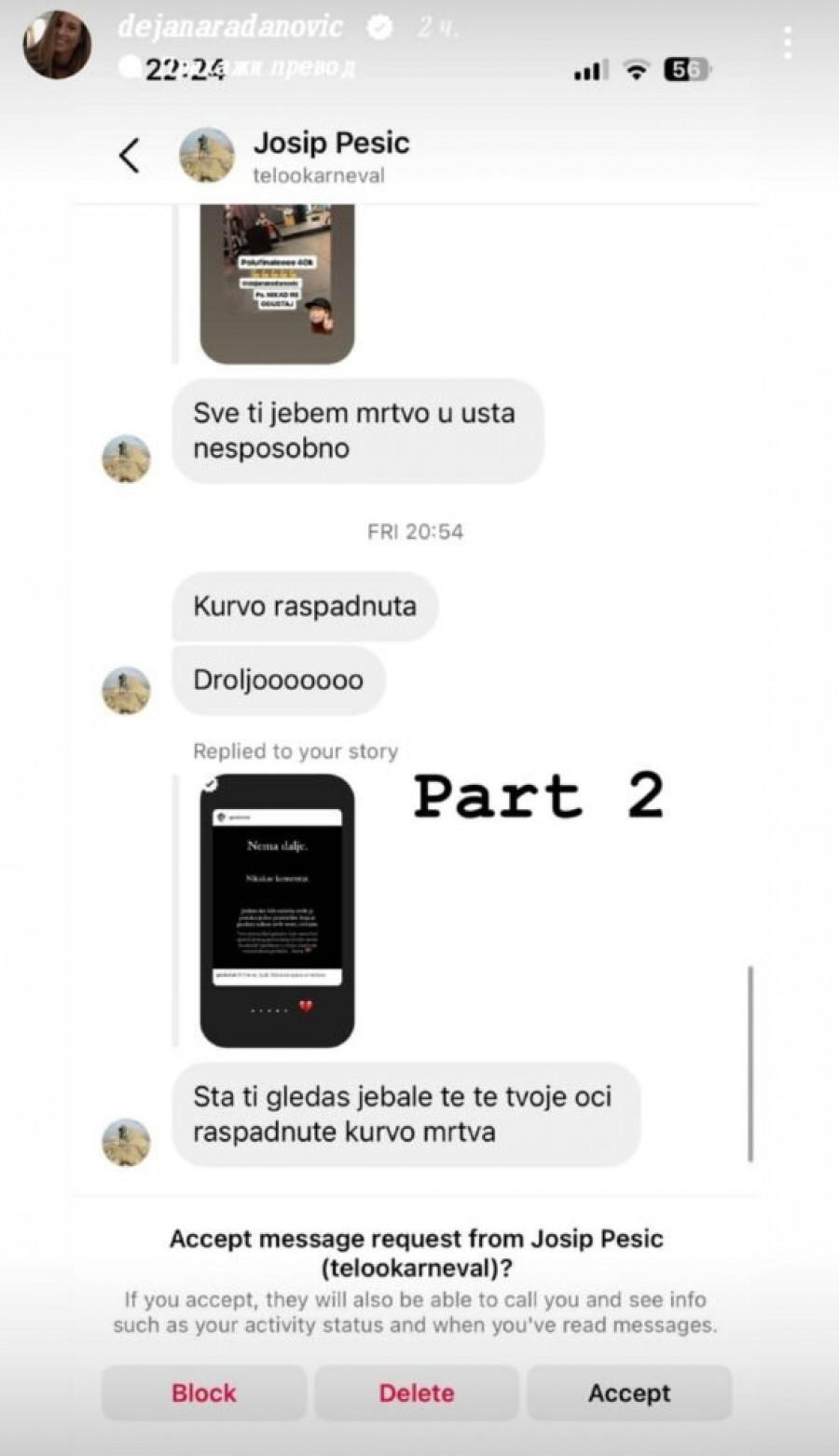 - Jedan od običnih dana u inboksu - napisala je Dejana postavljajući printskrinove sramnih prozivki u kojima je nazivaju „ku**om raspadnutom četničkom“, psuju joj „mrtvu majku nameštenu“ i ostale stvari koje ne priliče normalnom mozgu.