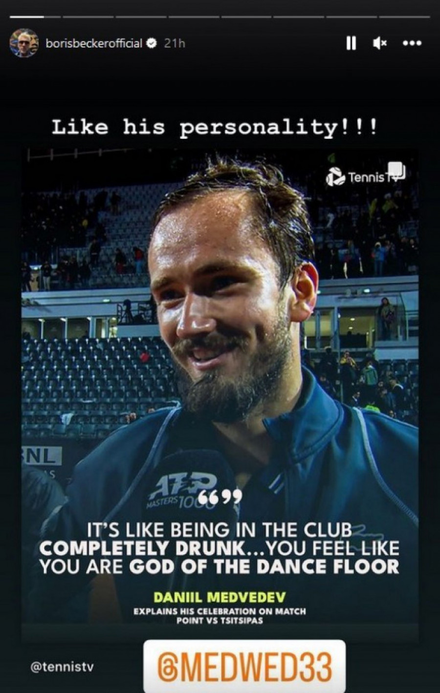 Uspeh Moskovljanina na "Foro Italiku" nije prošao nezapaženo ni kod legendarnog nemačkog asa Borisa Bekera. Bivši broj jedan svetskog tenisa i nekadašnji trener Novaka Đokovića, oglasio se i čestitao Medvedevu.
