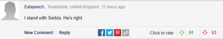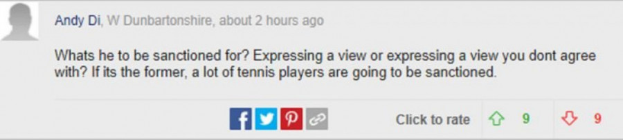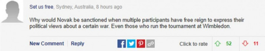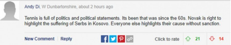 Međutim, očigledno je da svetska javnost ne osuđuje Đokovića u tolikoj meri zbog pomenutog natpisa o čemu svedoče i mnogobrojni komentari koji su ostavljeni na sajtu britanskog "Dejli mejla", a na kojima je Novak dobio i podršku brojnih korisnika.