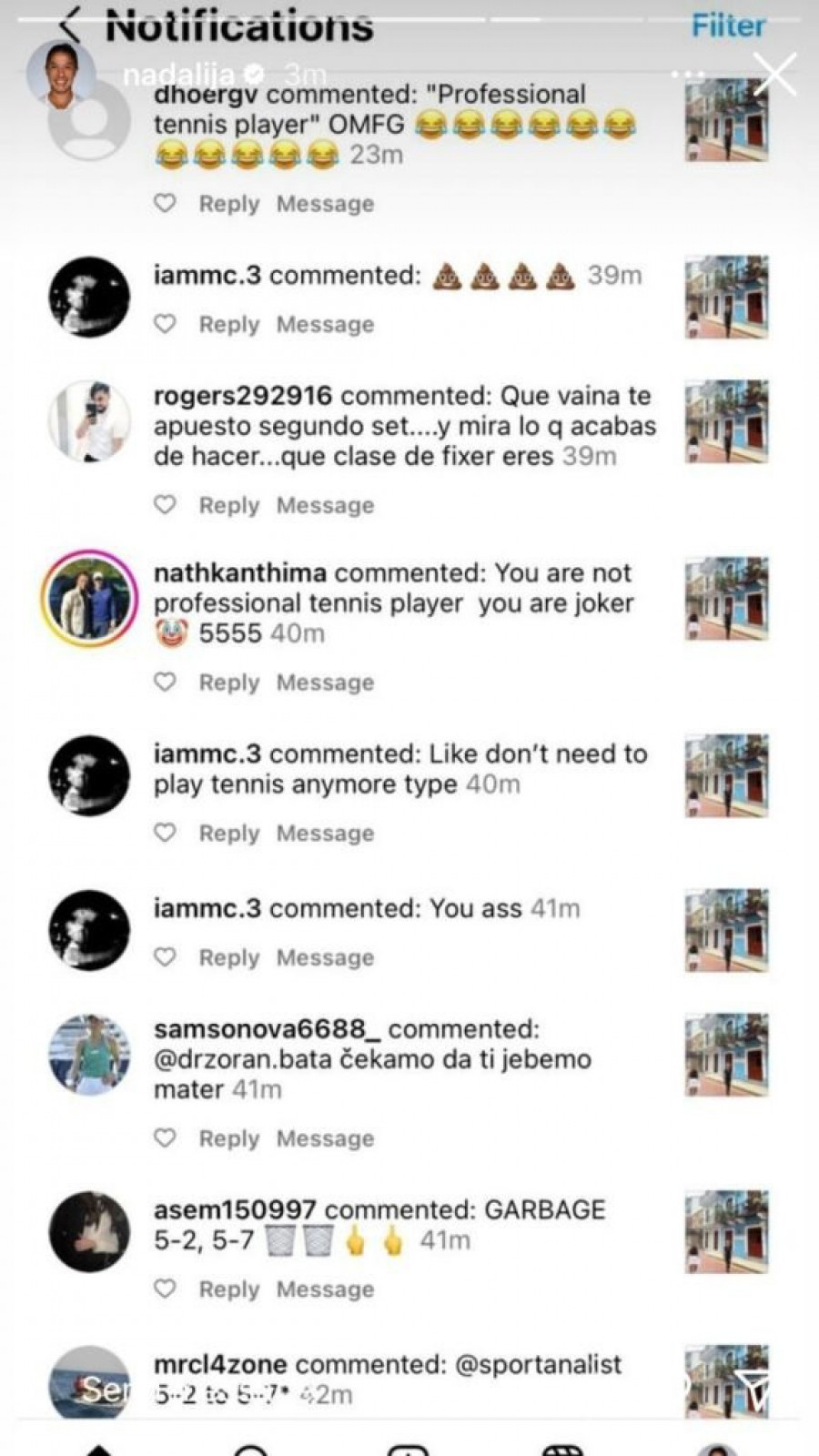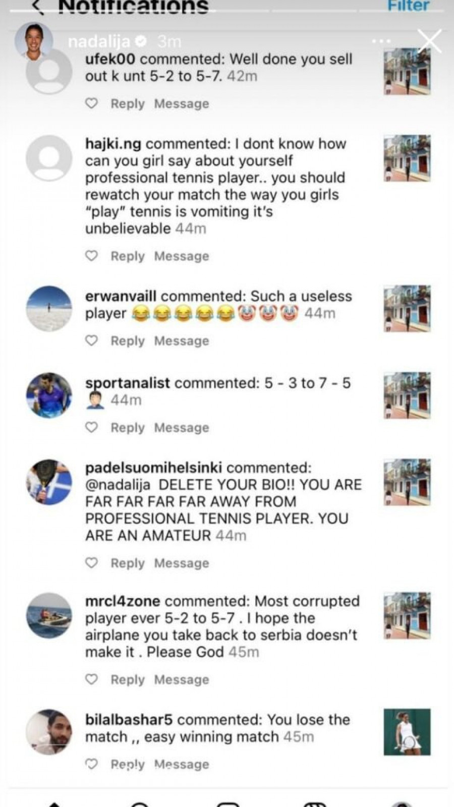 - Šta bi trebalo da kažem nakon ovoga? Treba da brinem za moj život, samo zato što sam izgubila nakon povrede? Sportisti daju sve najbolje na terenu i ovakve preteće poruke su nešto stvarno ozbiljno! Postavljam ovo po prvi put, zato što sam umorna od dobijanja ovakvih poruka osim kada dobijam mečeve - napisala je ona na Instagram storiju.