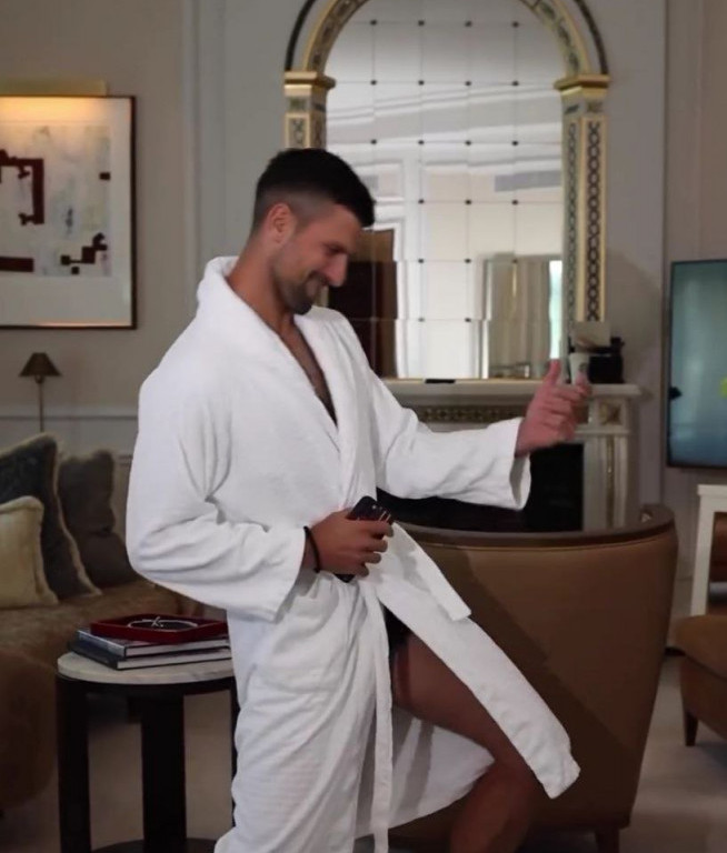 Međutim, danas je na društvenim mrežama osvanuo video na koje se vidi kako se Novak i Jelena pripremaju za gala. Ti intimni momenti su dodatno približili publiku slavnom teniseru i otkrili delić atmosfere iza scene. Međutim, Novak je otkrio možda i više nego što je planirao, ali se, srećom, nije videlo baš sve. Naime, gotovo na početku snimka, Nole oponaša kako svira gitaru samo u bademantilu, a onda se ogrtač otvorio i videlo se dosta visoko uz butinu. Gotovo i Noletov ponos.