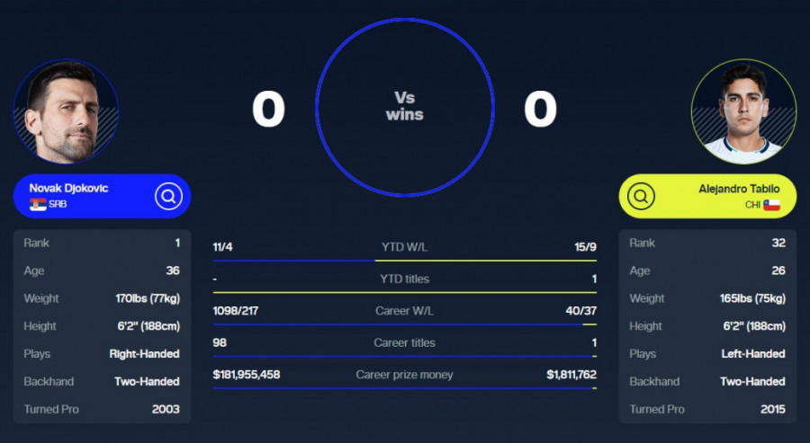 Do sada, Novak Đoković i Alehandro Tabilo nisu imali prilike da se međusobno sastanu, tako da će se danas na Mastersu u Rimu odigrati njihov prvi međusobni duel.