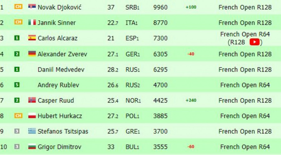 Italijan Janik Siner se nalazi na drugom mestu sa 8,770 bodova, samo 1,190 bodova manje od Đokovića, dok je Španac Karlos Alkaraz treći na listi sa 7,300 poena. Nole će sigurno zadržati prvo mesto do kraja Rolan Garosa, ali će nakon toga zavisiti od njegovog rezultata i Janika Sinera, koji mu prati svaki korak.