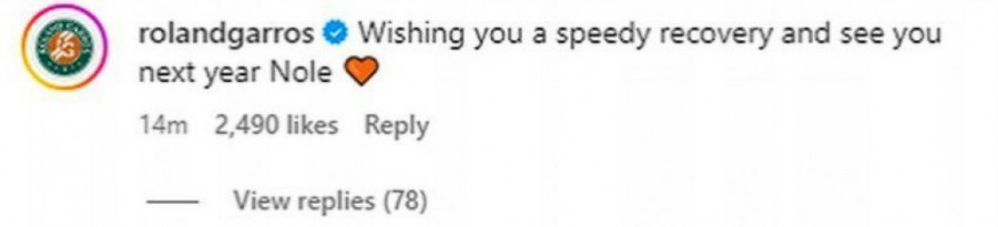 - Želimo ti brz oporavak i vidimo se sledeće godine Nole - piše u objavi Rolan Garosa.