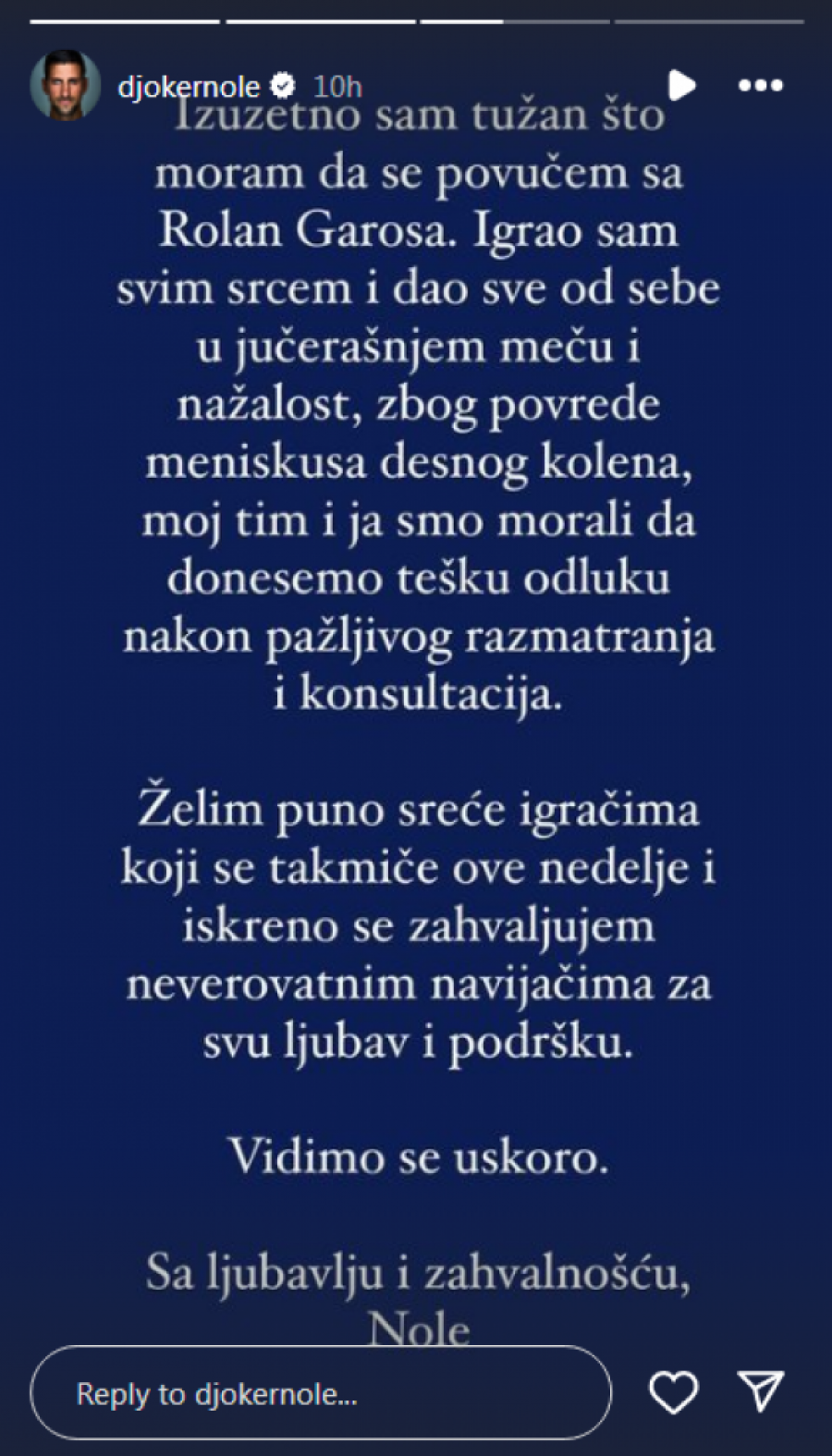 Iako je povlačenje s Rolan Garosa razočaralo mnoge navijače, Novak Đoković je zahvalio svojim pristalicama na podršci i najavio skori povratak na teren.