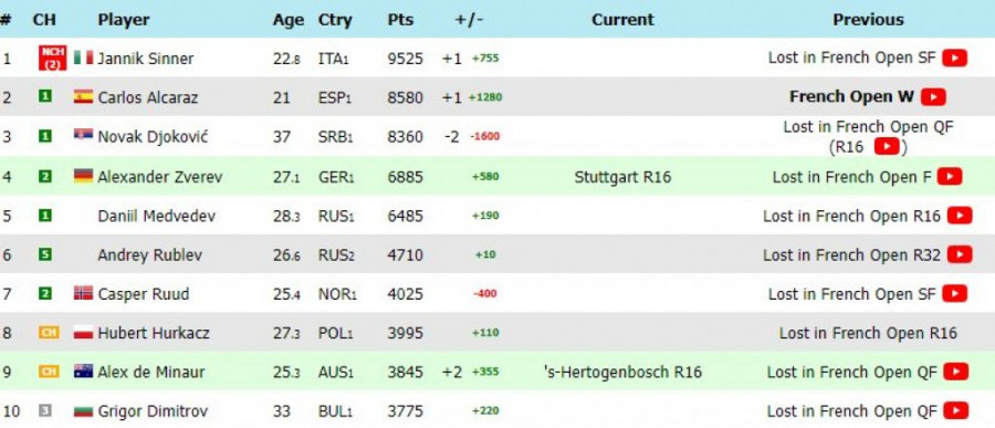 Kada je reč o listi najboljih deset tenisera sveta, petu i šestu poziciju drže Rusi Danil Mdvedev i Andrej Rubljov, a slede Kasper Rud i Hubert Hurkač. Plasmanom u četvrtfinale Otvorenog prvenstva Francuske, australijski teniser Aleks de Minor se popeo na devetu poziciju, dok deseto mesto drži Grigor Dimitrov iz Bugarske.