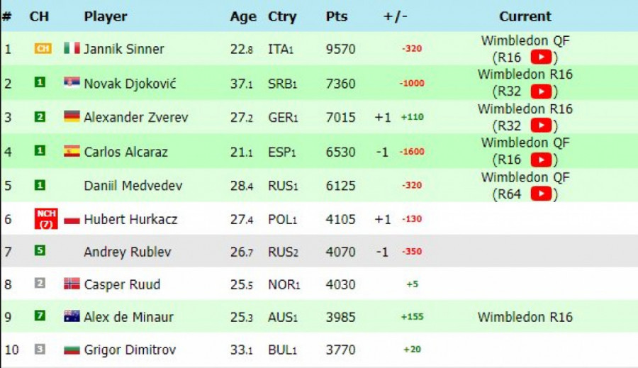 Janik Siner je i dalje na poziciji "broj jedan", ali u odnosu na prethodni ponedeljak ima 320 poena manje. Đoković je i dalje drugoplasirani, a s obzirom na gubitak 1.000 bodova, u ovom momentu ima preko 2.000 poena zaostatka za Italijanom.