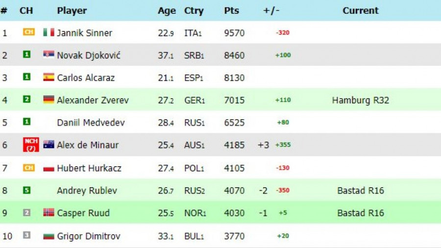 Napredak na ATP listi već pomenutog Aleksa de Minora uslovio je pad Andreja Rubljova i Kaspera Ruda, a među deset odabranih nalaze se i Hubert Hurkač i Grigor Dimitrov.