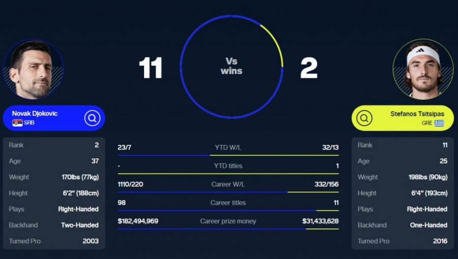 Dvojica tenisera su dosad odigrala 13 međusobnih duela. Ubedljivo bolji skor ima srpski teniser koji je slavio 11 puta, a Cicipas trijumf nad Novakom čeka pola decenije, s obzirom da je poslednji put slast pobede osetio u četvrtfinalu mastersa u Šangaju 2019. kada je slavio rezultatom 2:1 (3:6, 7:5, 6:3).