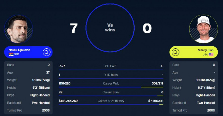 Treba podsetiti da su tokom profesionalne teniske karijere Novak Đoković i Mardi Fiš odigrali sedam zvaničnih mečeva, a ostvareni skor je svakako poražavajući po Amerikanca. Najbolji teniser u istoriji ovog sporta ostvario je svih sedam trijumfa prepustivši Fišu samo četiri seta.