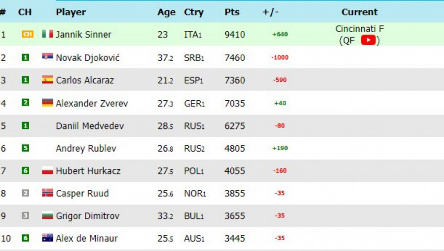 Najnovija ATP lista ne donosi promene kada je u pitanju plasman među TOP 10 tenisera planete, ali promene nastaju u bodovnom saldu. I dalje je Janik Siner na čelnoj poziciji i u ovom momentu ima 9.410 poena, gotovo 2.000 više od Đokovića, dok se trećeplasirani Karlos Alkaraz približio na samo 100 poena zaostatka.