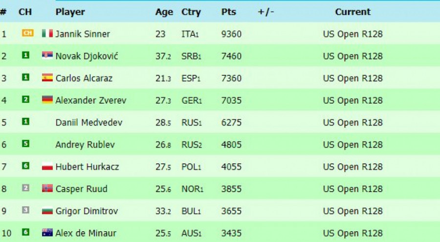 Siner će gotovo sigurno zadržati prvo mesto na ATP listi i nakon završetka US opena, budući da niko od najbližih rivala nema šanse da ga sustigne. Novak Đoković, sa 7.460 bodova, neće moći da osvoji više bodova od toga nakon završetka poslednjeg Grend slema.